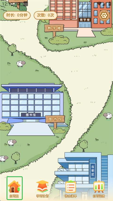 1、进入自律自习室App,用户可以下滑选择自习场景,有教学楼、图书馆、在职区、私人自习室。