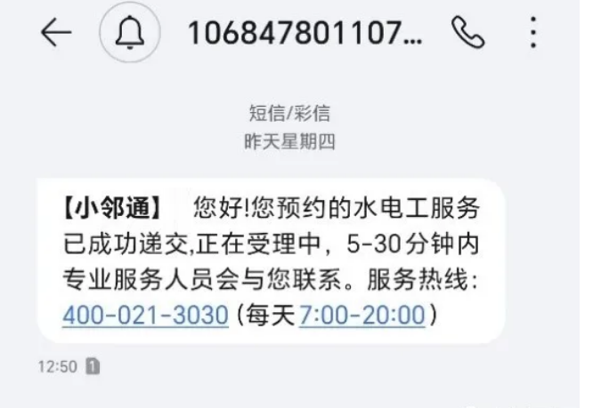 3、订单预约成功后,老同志将收到短信,小邻通相关服务人员将主动电话联系老同志,确定上门服务时间。