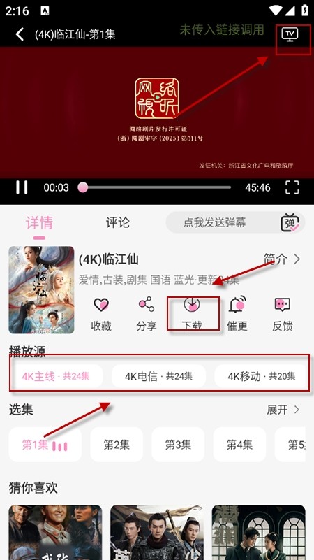 3、在播放视频卡顿时也可以换源播放,下载和投影也都可以。