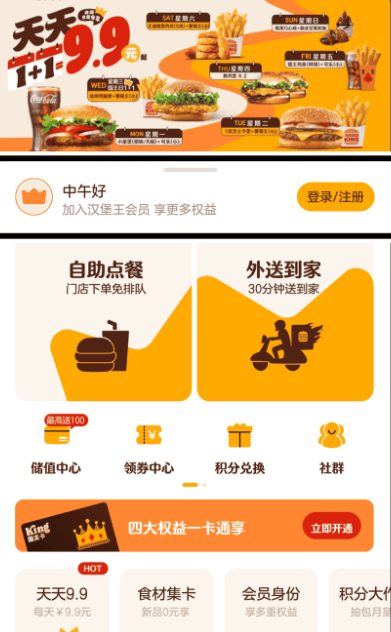 汉堡王中国是汉堡王Burger King中国区为中国消费者打造的手机点餐、领券app,界面中文显示,无需任何设置可直接正常使用。通过这款应用,用户可以随时随地浏览汉堡王的丰富菜单,从经典汉堡到美味小吃,应有尽有。APP支持在线点餐、外卖配送和到店自提等多种服务方式,让用餐更加灵活便捷。特别是汉堡王中国APP还提供了丰富的优惠活动和专属福利,如新用户首单优惠、每周三“国王日”特惠等,让用户每次用餐都能享受到实实在在的折扣。