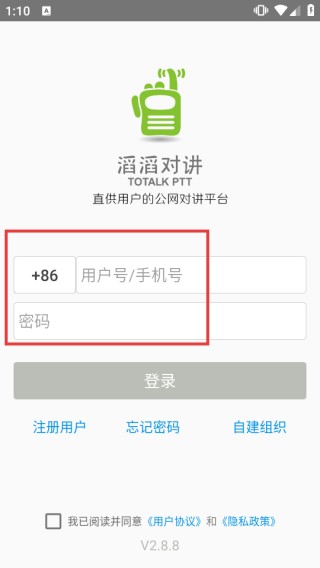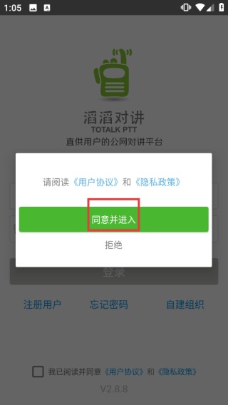 1、打开“滔滔对讲”应用,在弹出的提示窗口中点击【同意并进入】按钮,接受相关协议后进入应用。