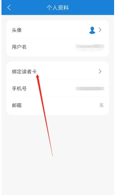 3、在个人资料中,就能看到“绑定读者卡”的选项了,点击进入;