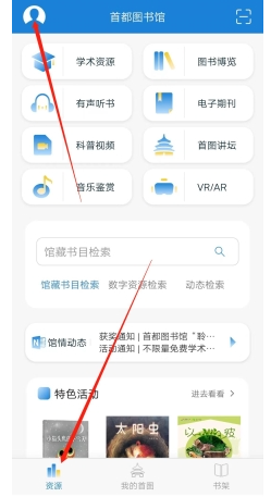 1、进入APP后,首先点击左下角“资源”,再点击右上角的“头像”;