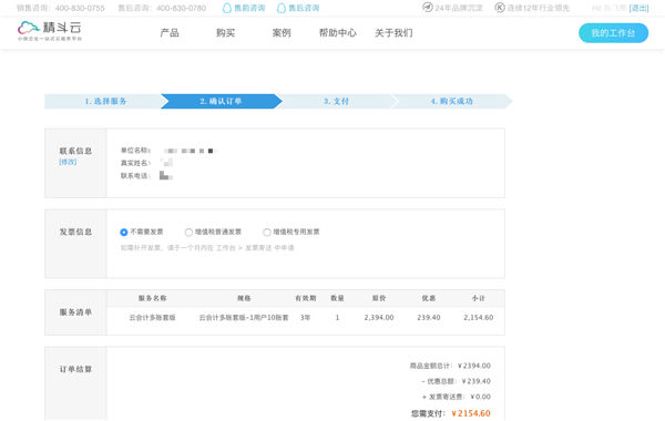 第二步:选择您所需要的购买产品的相关信息,选择用户数,有效期和数量,选择不同的用户数及有效期,购买价格也不会不同,最后点击确认。