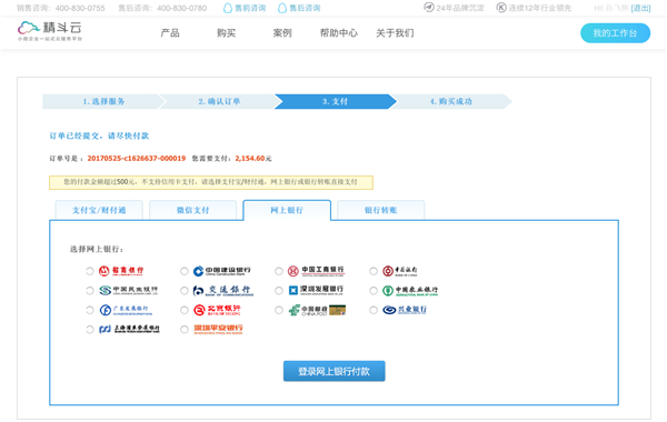 第一步:您可以根据您最方便的方式选择不同的支付方式(支持网上银行、微信、支付宝付款)。