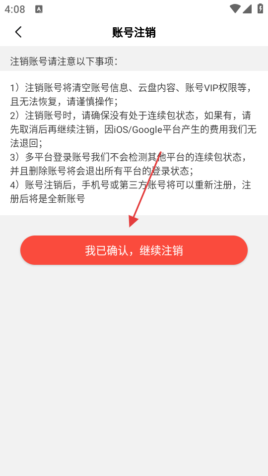 4进入账号注销相关界面后,认真查看并了解页面上的各项提示信息,确认无误后,找到并点击用于继续注销流程的对应按钮。